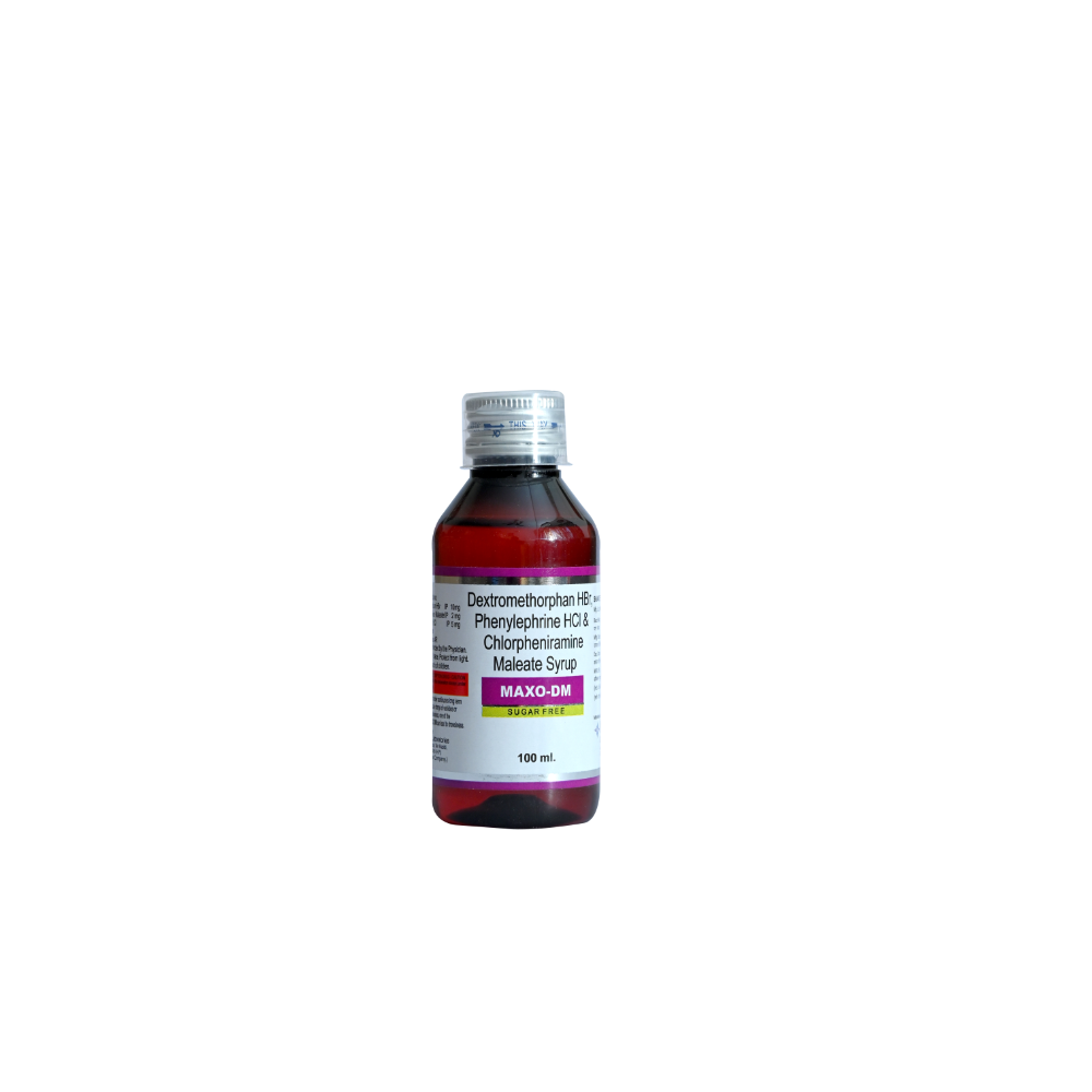 Maxo-DM syrup is a combination of three drugs, namely: Chlorpheniramine (antihistamine), Phenylephrine (decongestant) and Dextromethorphan (cough suppressant). Chlorpheniramine works by blocking the action of histamine, a substance responsible for causing allergic reactions. Phenylephrine helps in shrinking the blood vessels located in the nasal passage, thereby reducing stuffy nose. Dextromethorphan works by blocking the transmission of nerve signals from the cough centre in the brain to the muscles that produce cough. Collectively, it helps to provide relief from dry cough.