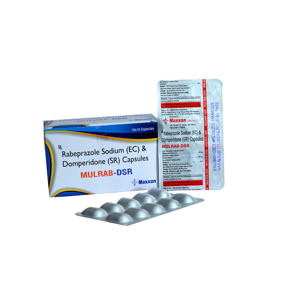 Mulrab-DSR is a gastrointestinal medicine composed of Rabeprazole and Domperidone. Together, these two medicines reduce the amount of excess acid production in your stomach and decrease the symptoms of nausea and vomiting. It treats symptoms of acid reflux due to hyperacidity, stomach ulcer (Peptic ulcer disease), and Zollinger Ellison syndrome (overproduction of acid due to a pancreatic tumour). Besides this it is used for short-term to treat symptoms of gastroesophageal reflux disease (GERD).